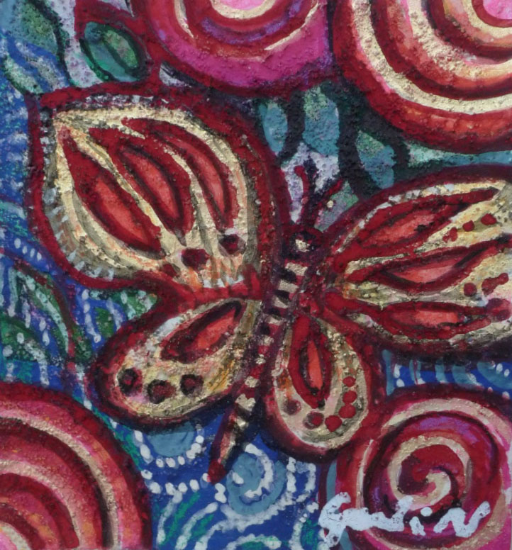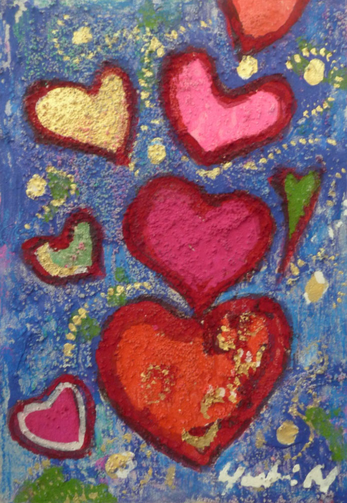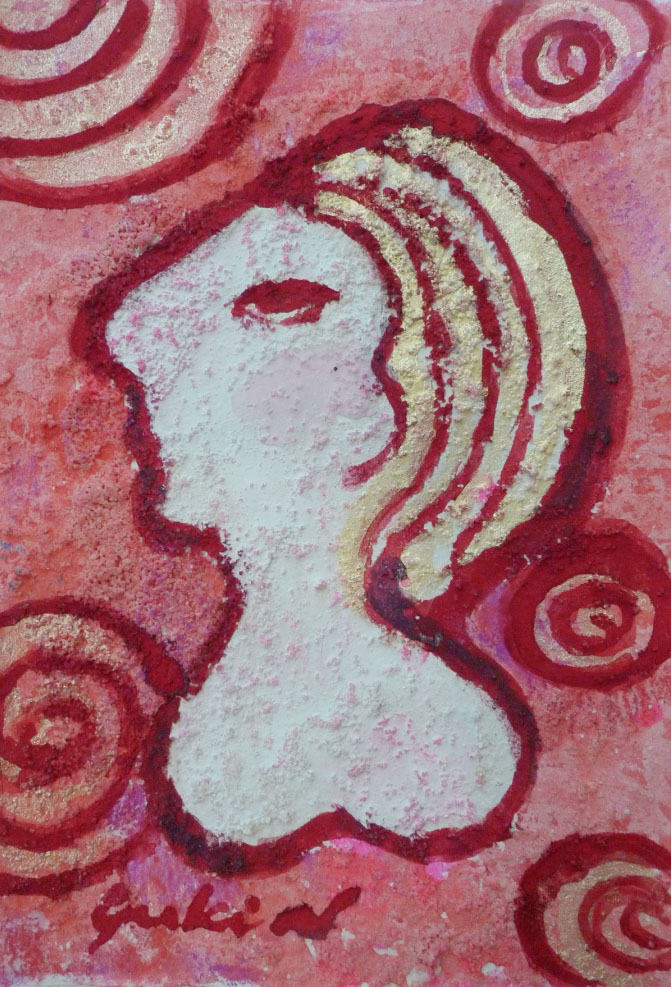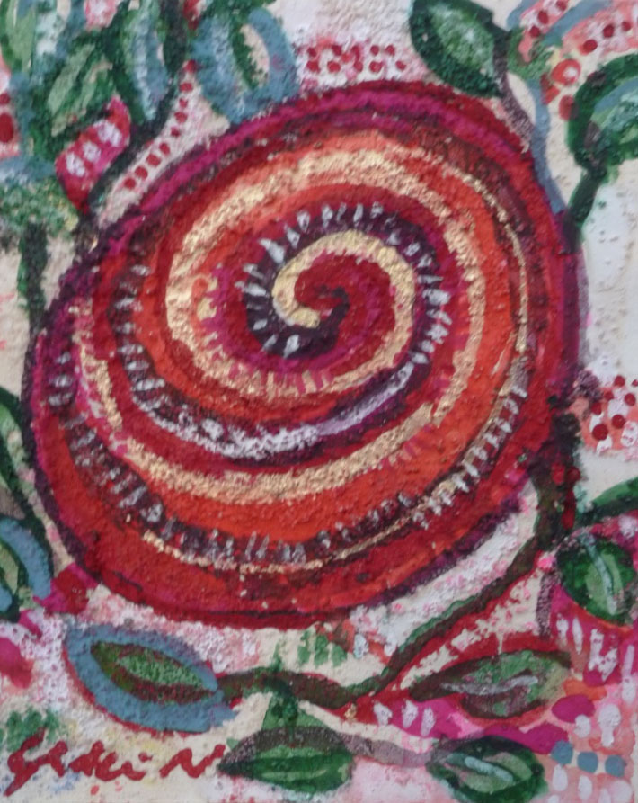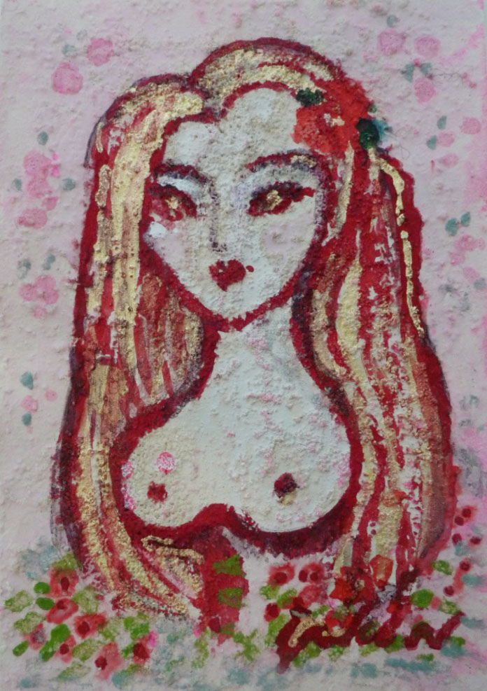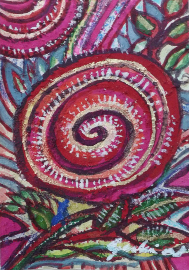 ドリッピングや点描そして躍動的な線と線の交差による旋律。色は赤を基調とした作品が多く、日本画で用いられる岩絵具をメインにアクリル絵具、インク、パステルを織り混ぜて醸される澄明でなお深いその発色は彼女ならではでしょう。同時にこれら種類の違う絵具の素材感が同一画面上で、時には幾重にも重なり波打ちうねる絵肌の様はエロティックですらあります。