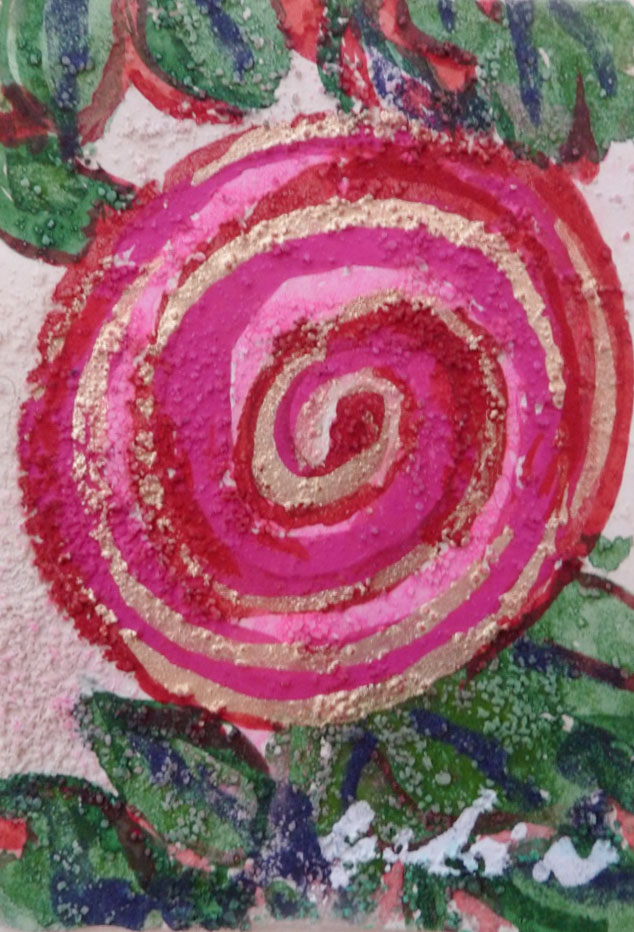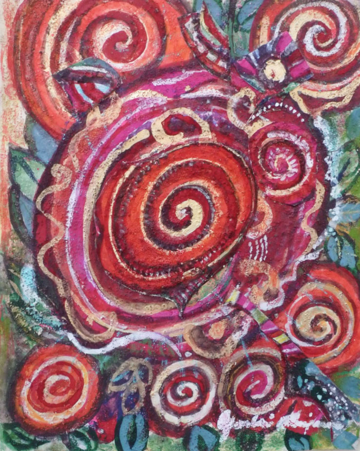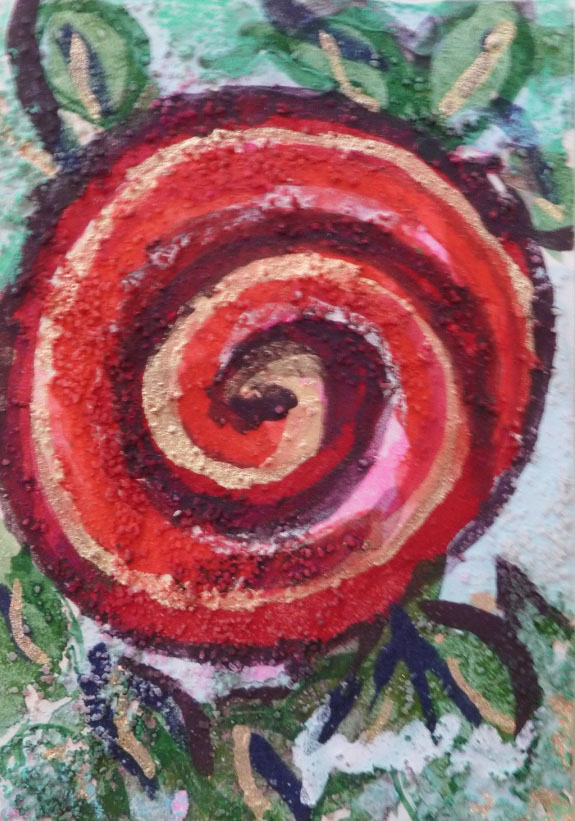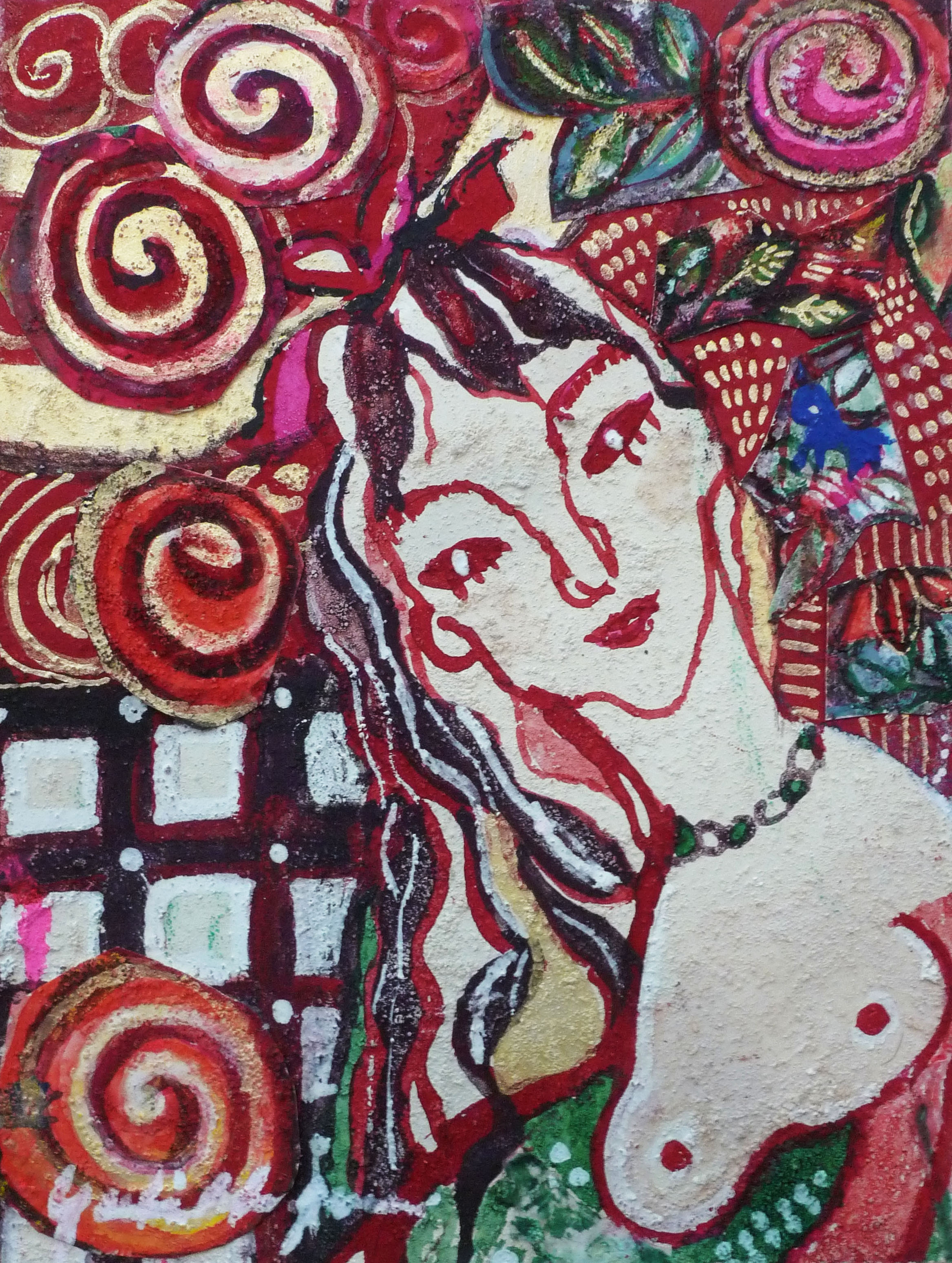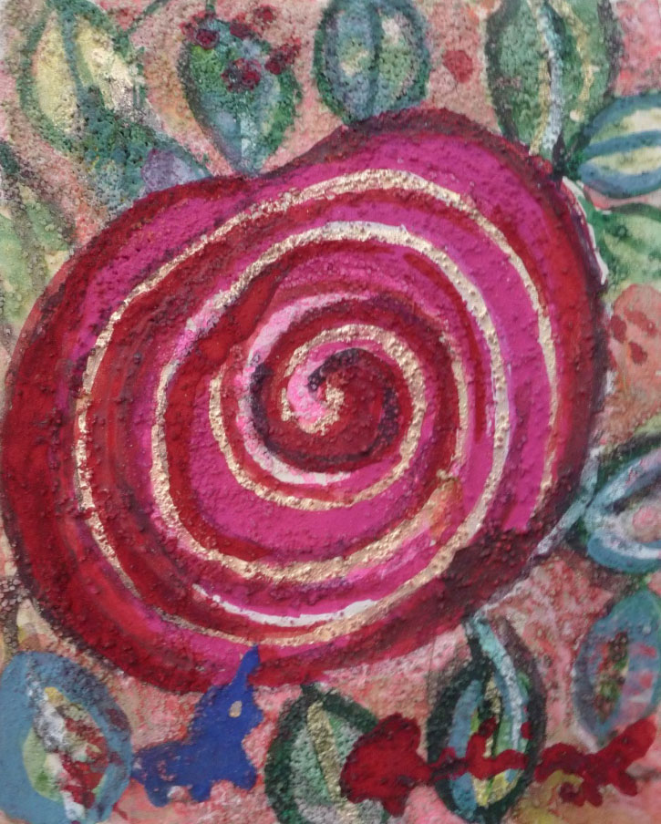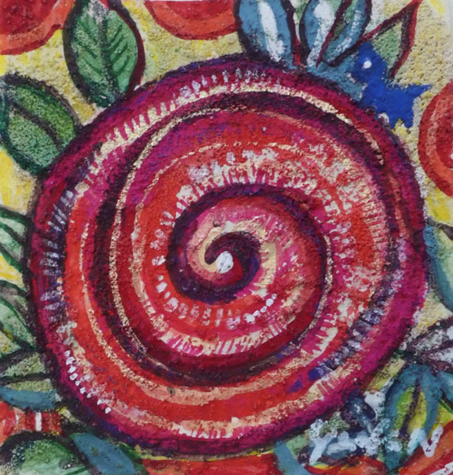 ドリッピングや点描そして躍動的な線と線の交差による旋律。色は赤を基調とした作品が多く、日本画で用いられる岩絵具をメインにアクリル絵具、インク、パステルを織り混ぜて醸される澄明でなお深いその発色は彼女ならではでしょう。同時にこれら種類の違う絵具の素材感が同一画面上で、時には幾重にも重なり波打ちうねる絵肌の様はエロティックですらあります。