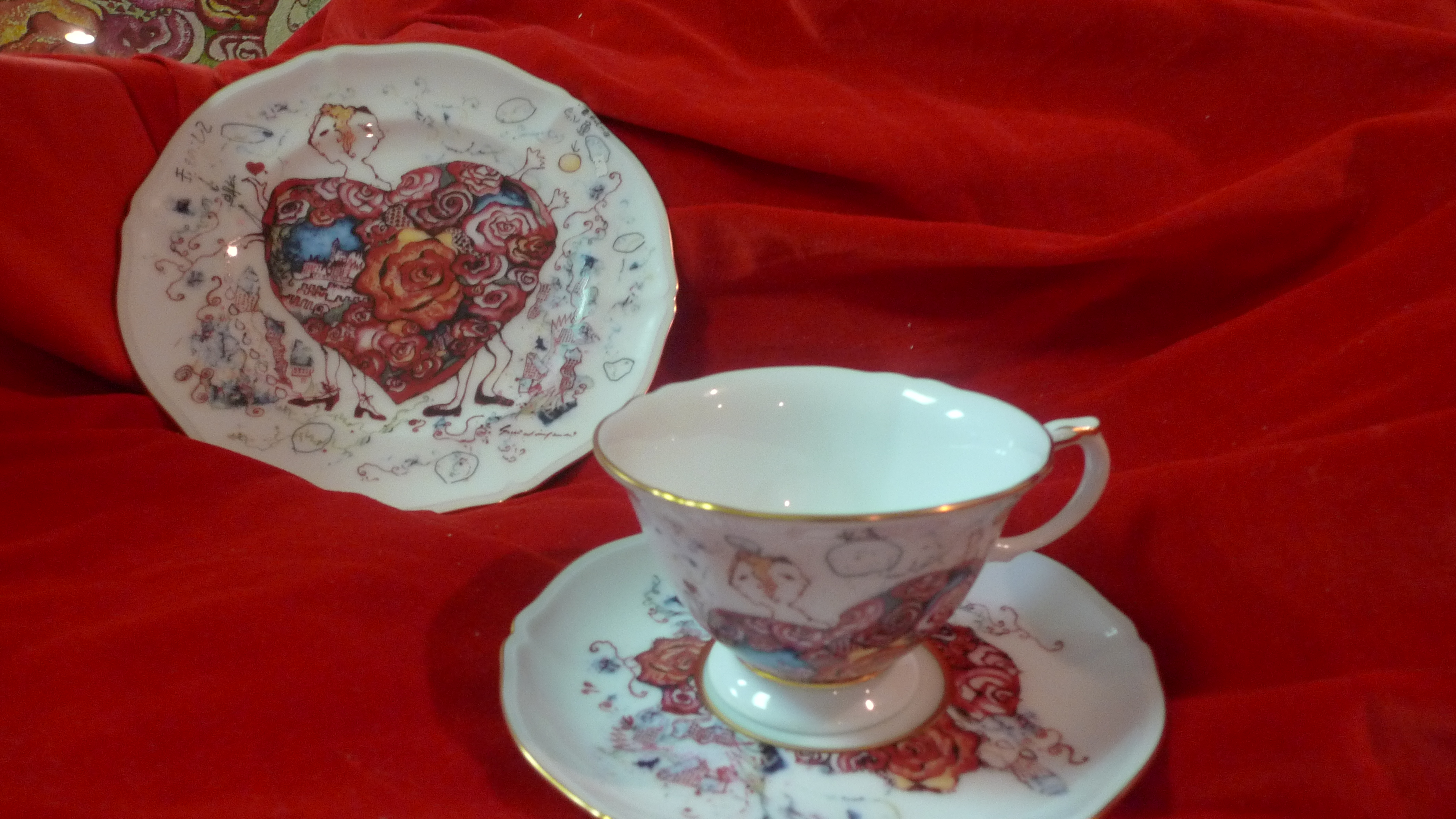 「Androgynous−いつも一緒に−」をモチーフとした大倉陶園制作のカップ&ソーサー等を展覧。