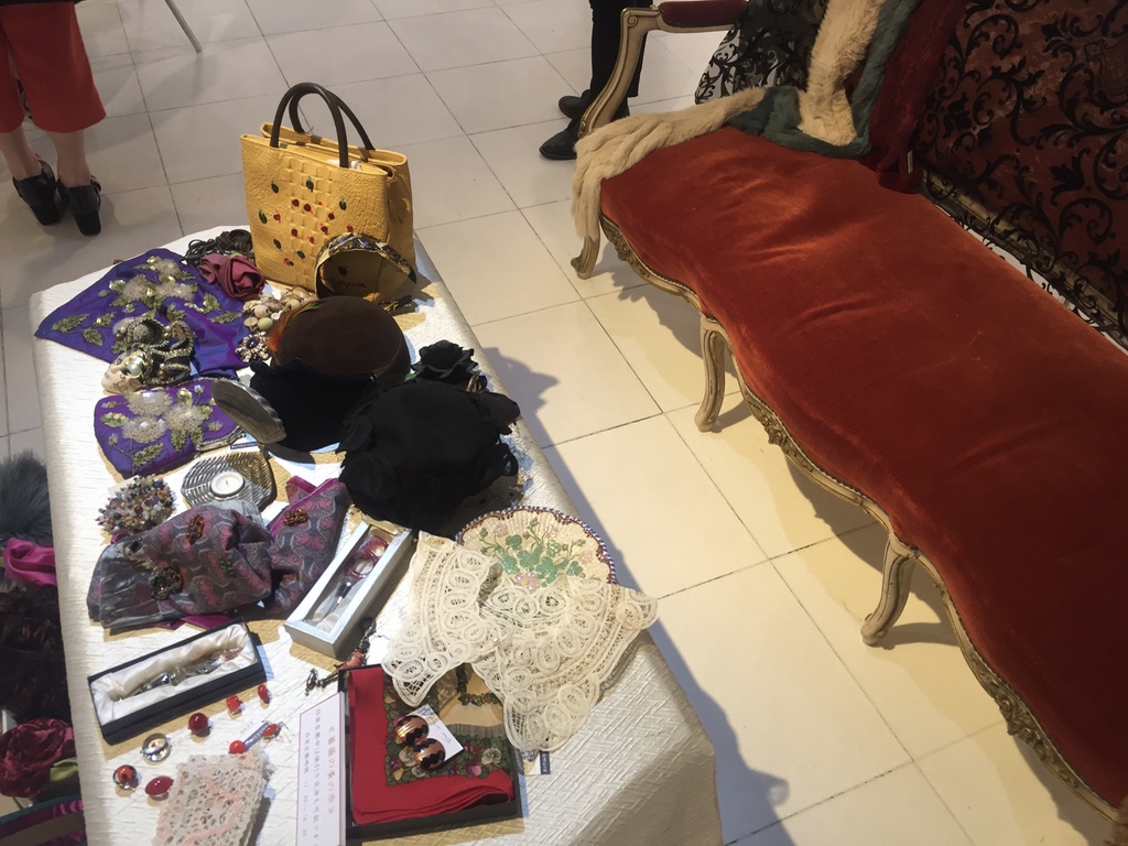 会場内にて蜷川有紀の愛したアクセサリーやスカーフ、バッグやワインの蓋 etc.