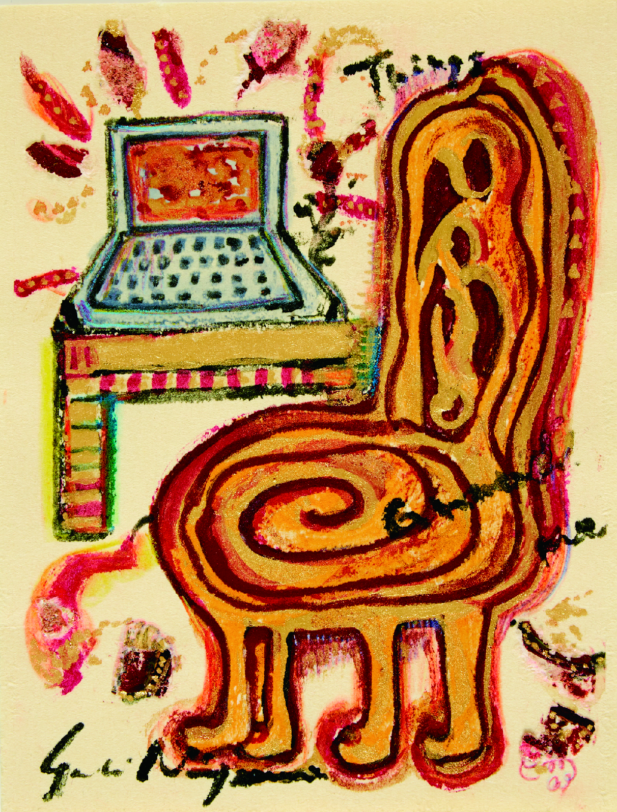 | 『目の前に在る物 - 椅子とラップトップ -』 W16.5×H21.3 和紙・岩絵具・コラージュ 2023年 |