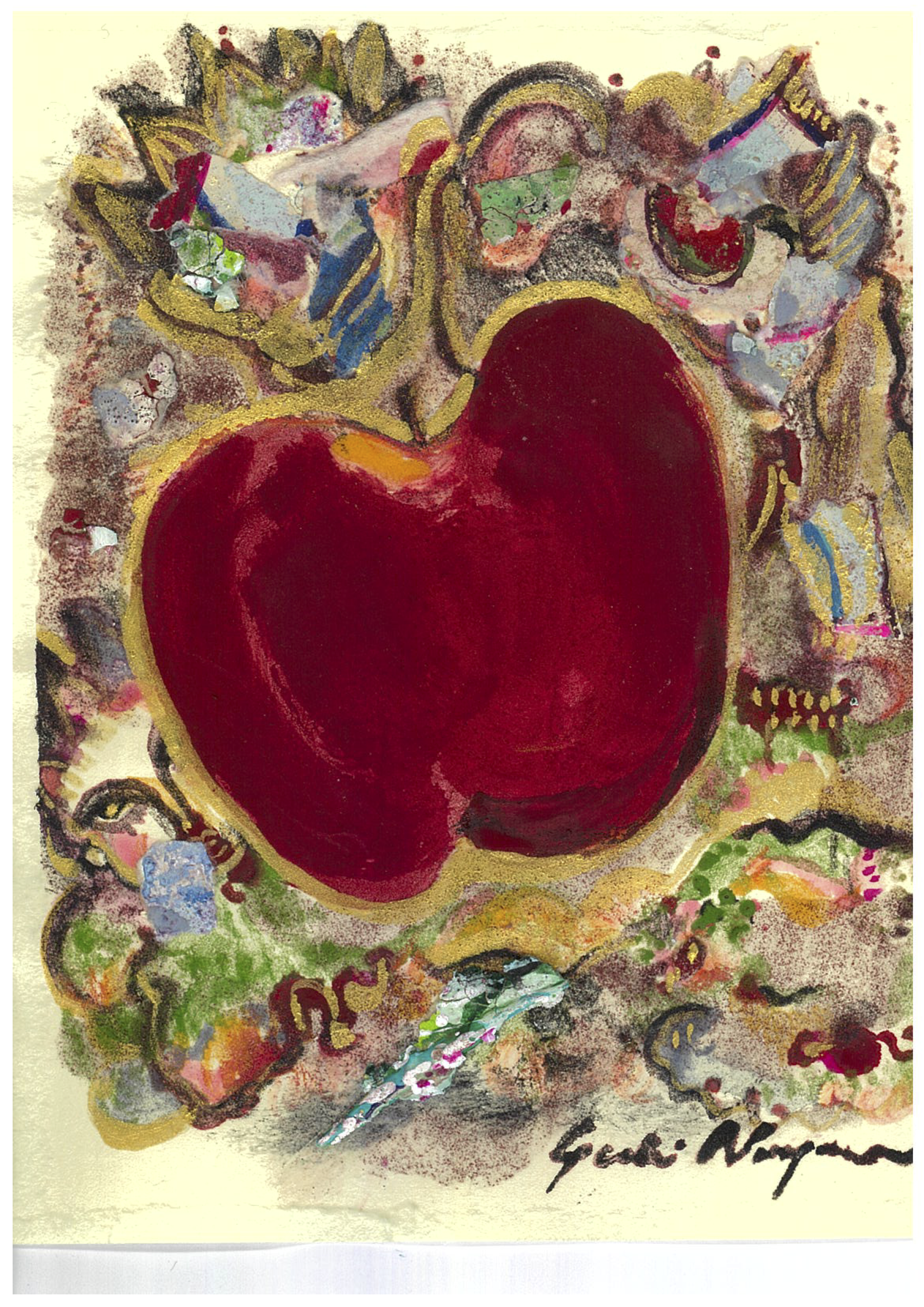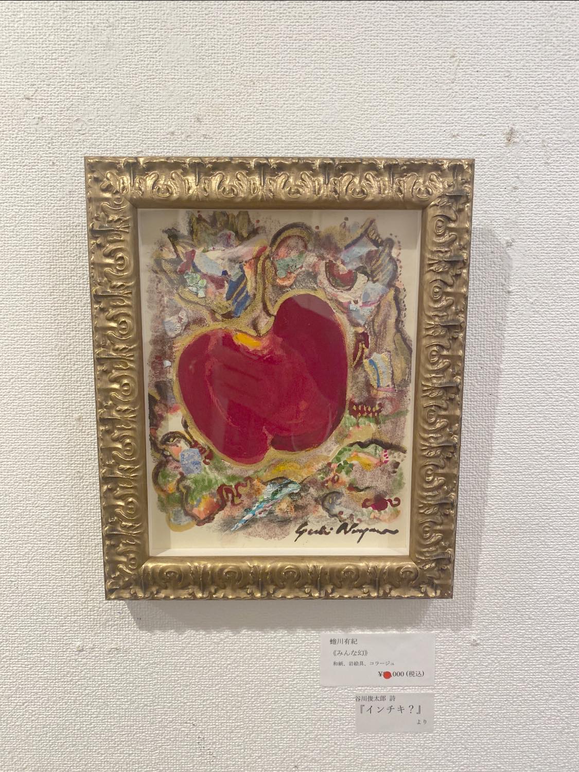 アダムとイブの禁断の木の実、白雪姫の毒の入った林檎。林檎には、「美しさ」「若々しさ」「知恵」「誘惑」「禁断」「悪」「愛」「不死」など相反する象徴的な意味あいを兼ねそなえた不思議な果実です。マティス、ルノワール、セザンヌそして数々のキリスト教絵画にも多くモチーフとして登場します。今回わたしが描いた林檎は、谷川俊太郎さんの詩「インチキ」からインスピレーションを受たのものです。絵に描いたものはみんなインチキ。という内容の詩です。