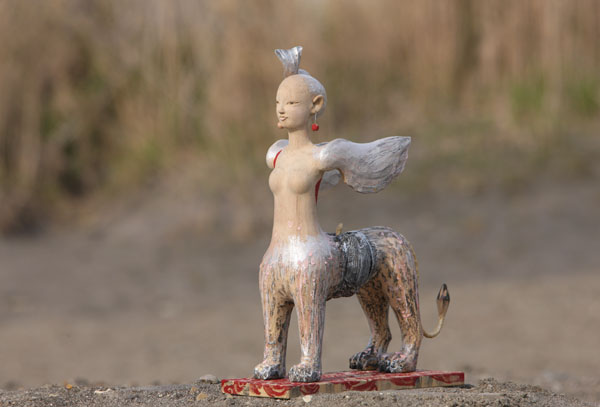 その子産石をイメージしたこの円形のオブジェに、女性たちが逍遥する姿や薔薇やカーネーションなどの絵をほどこしました。