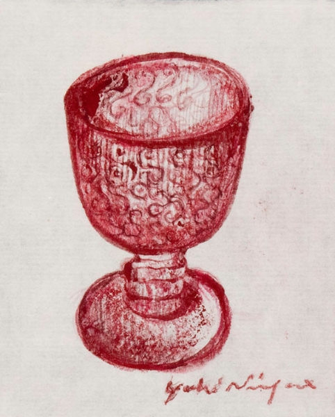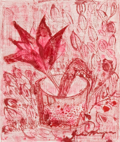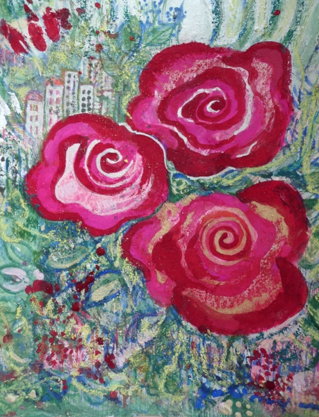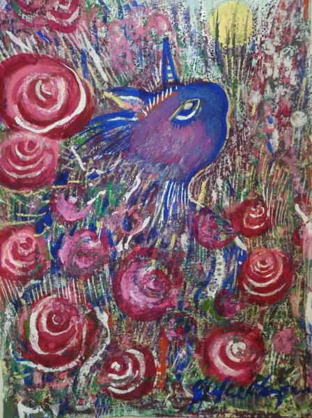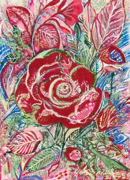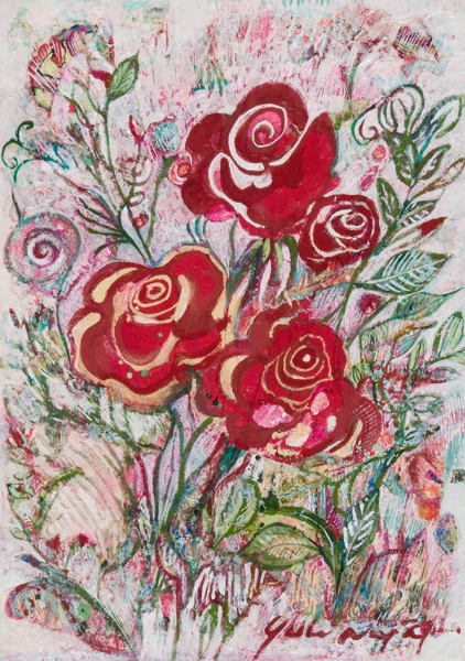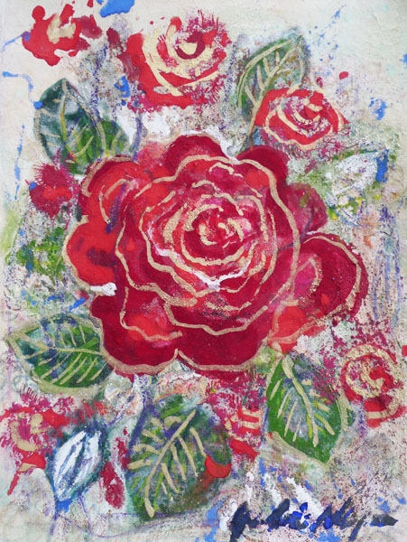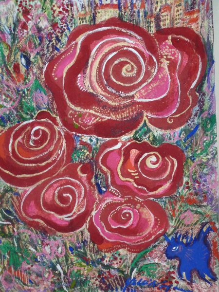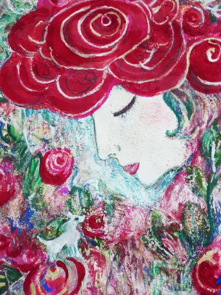 キャンバスからはみ出るかのように描かれている真紅のバラは生殖と豊饒の象徴であって、