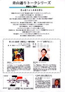 -青山トークシリーズ- 青山通りから未来を創る 2004.2.26 thu 青山学院大学教授・井口典夫さんのコーディネートで アートディレクターの浅葉克己さんとご一緒に 『表現すること』についてお話ししました。 (於:東急エージェンシー本社ビル) http://www.aoyamastreet.jp/ |