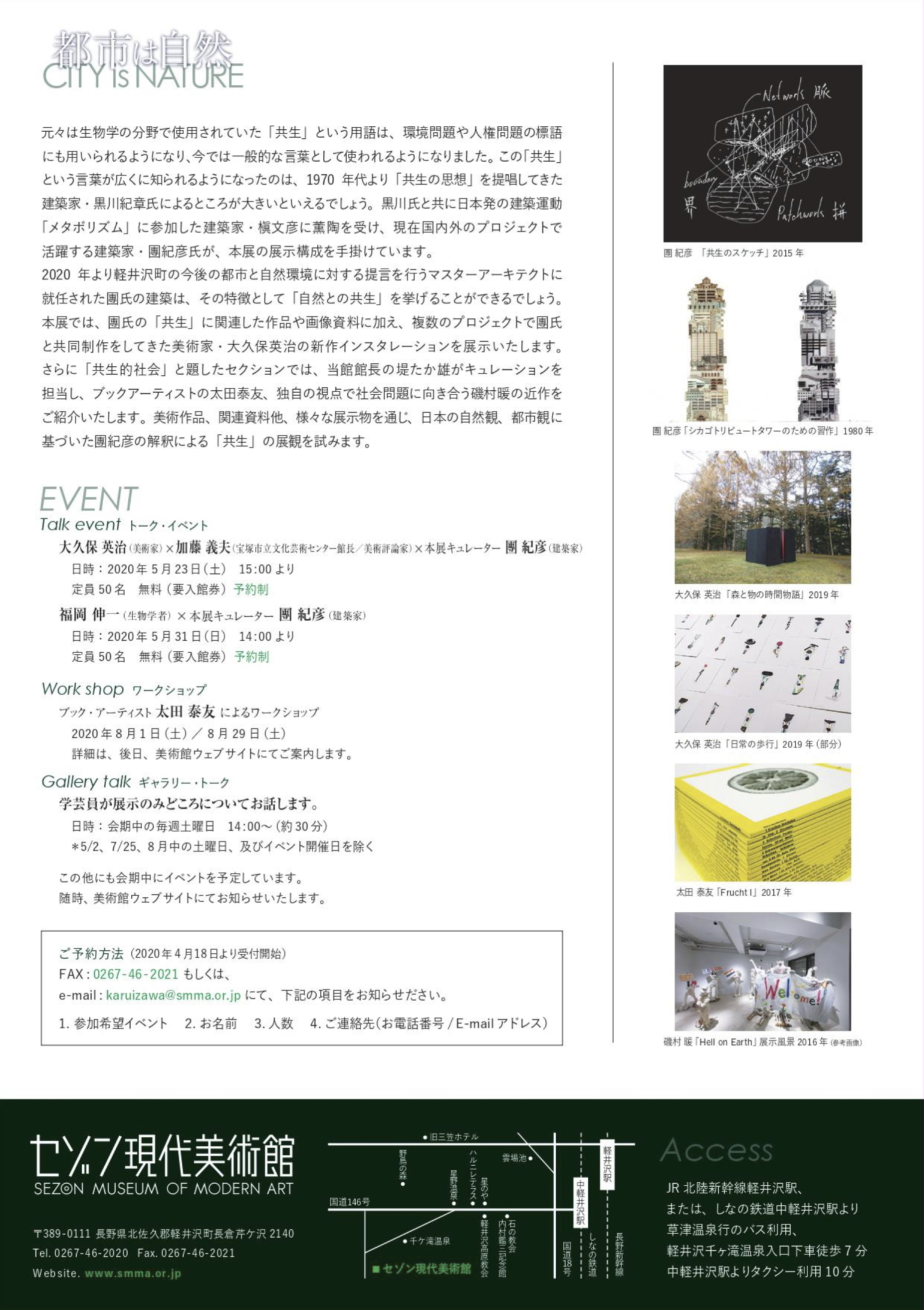 セゾン現代美術館のコレクションの中から「都市は自然」の琴線に触れるものを選び「人為と無為の共生」からのキュレーションを行った。展示室の入り口付近の手前の壁から奥の壁にかけて二つの対立する図像学の対比を作り、三つのコーナに同一アーティストに見出される人為と無為の織りなす作風の遍歴を記憶にとどめた。