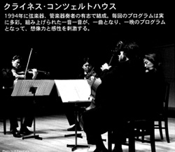 | 蜷川有紀がミレニアムを迎える年に企画.出演した朗読会+インターネットライブ「失いしものへの祈り」にゲスト出演していただいたチェリスト、小澤洋介さんの主催するkleines konzerthaus。今度は蜷川有紀がゲスト出演し質の高い弦楽四重奏と共にウィリアム・ブレイク他を朗読します。乞うご期待! |