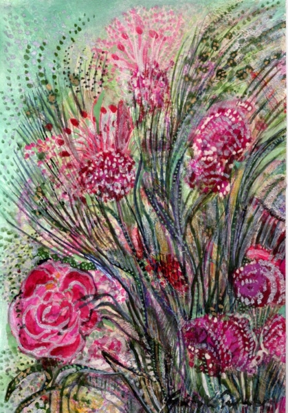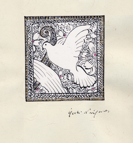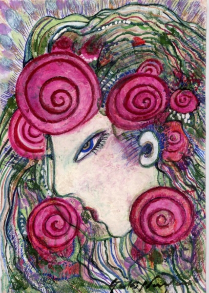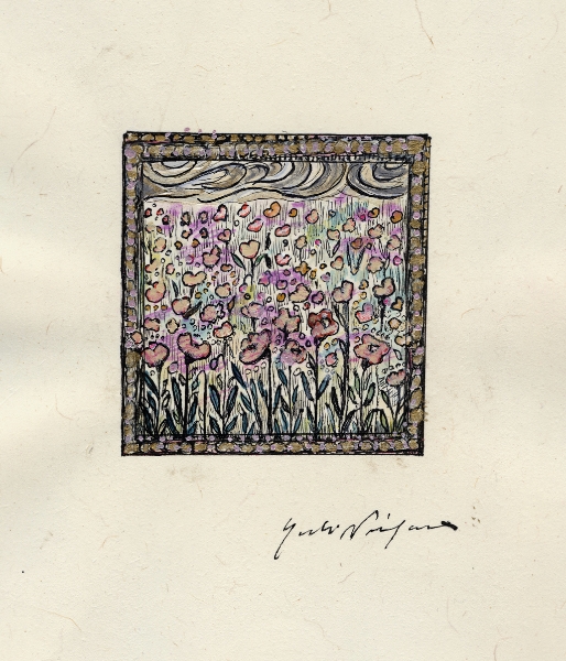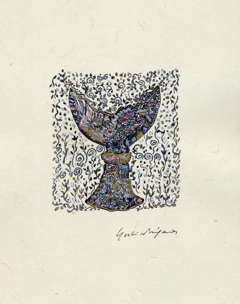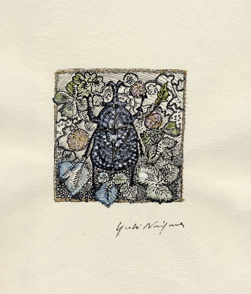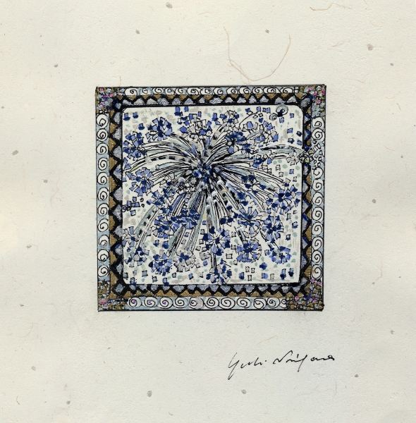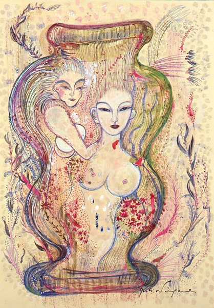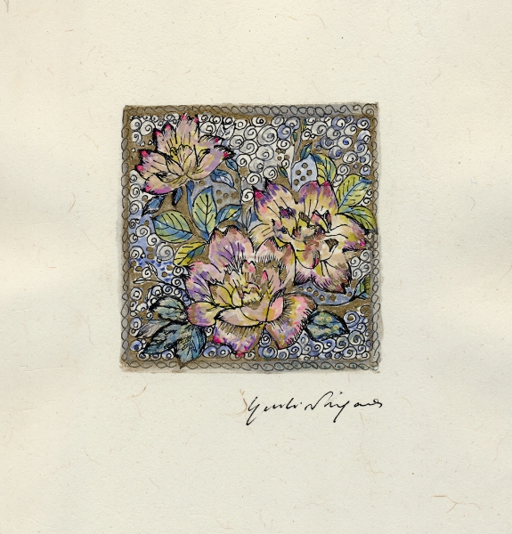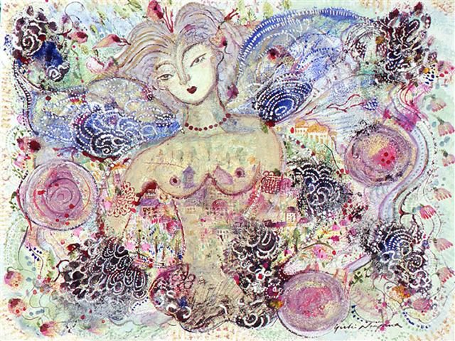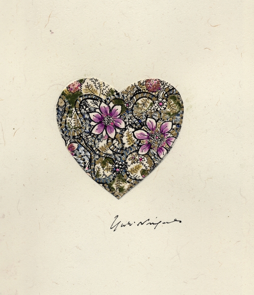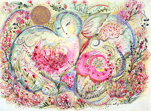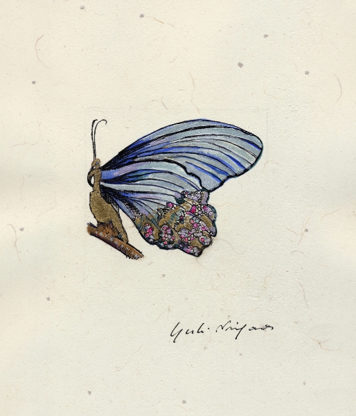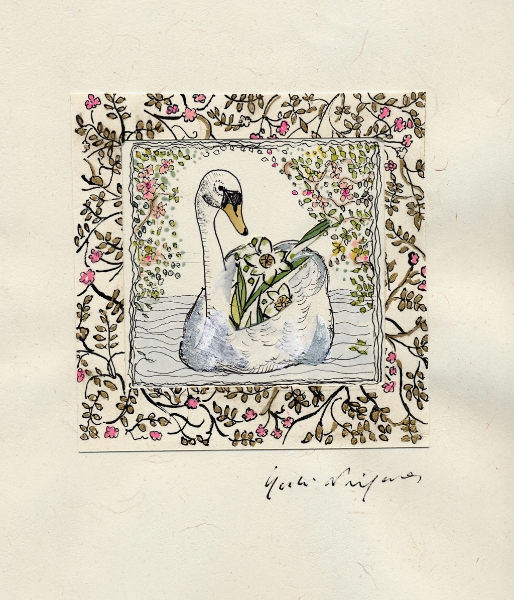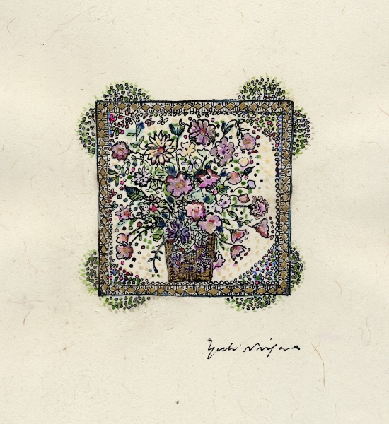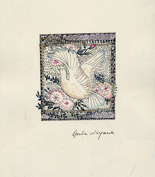 「なにを描きたいの?」 とたずねられ、 思わず「・・・愉悦」と、答えてしまった。 不思議。そんな答えが口をつくなんて。 愛する人に、抱きしめられたときのあの素晴らしい気持ち。 熟した果物や美しく咲き誇る花。信じられない色や形をした鳥や虫。 なんて素晴らしいものがこの地上には沢山あるのだろう。 子供の頃に感じていたよりも現実はもっともっと美しい。 そんな感動を描きたいと思った。 多くの素晴らしい方々との出会いが、 私に畏れずに表現する勇気を与えくれました。 この場をかりて、心よりお礼申し上げます。 2008.June.27 蜷川有紀 |