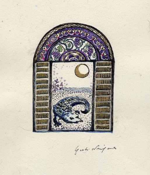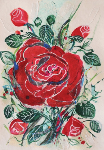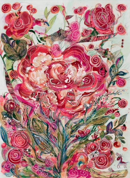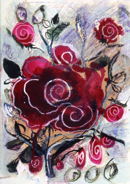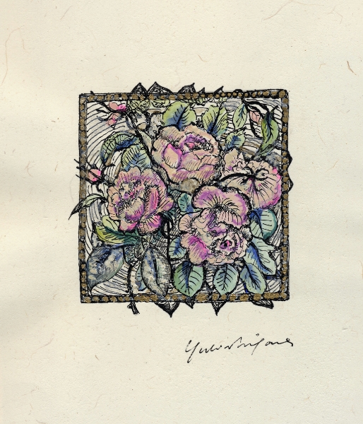 この展覧会では、日本画家・武田州左氏より岩絵具の手ほどきを受けて書き上げた最新作の他、今まで温めてきた未発表の旧作品、水野麗句集『花鳥都市』のための表紙画及び挿画、造形作家・友永詔三氏とのコラボレーションによるスフィンクス像をなどを出品しました。また、2004年に蜷川有紀が初めて脚本、監督を手掛けたショートムービー「バラメラバ」と自ら新たに撮影したイメージフィルム「薔薇めくとき」 を上映。美しく愉しい初個展になりました。